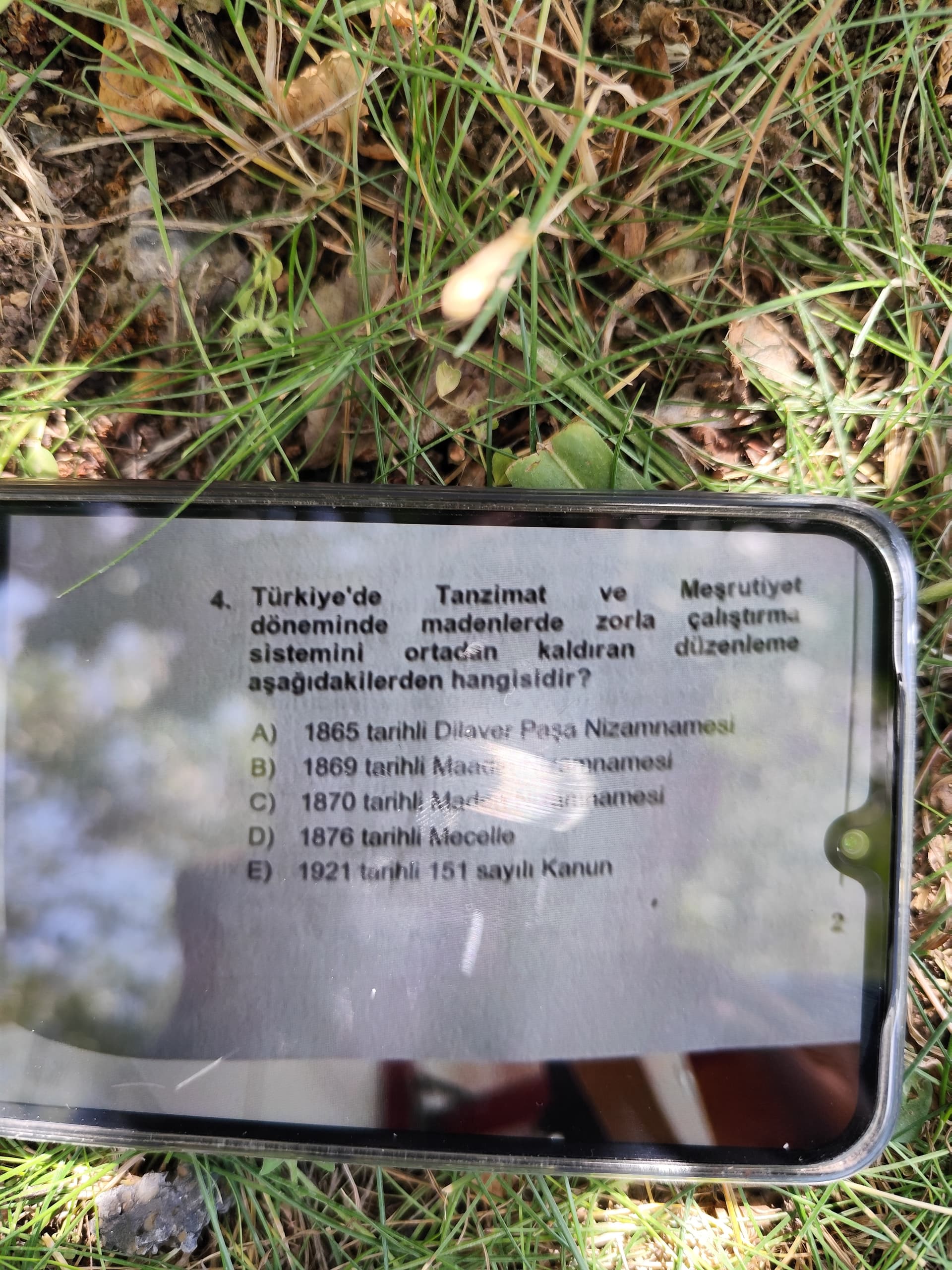 Bu görselde, Türkiye’nin Tanzimat ve Meşrutiyet dönemlerinde madenlerde zorla çalıştırma sistemini sona erdiren düzenlemenin hangisi olduğu sorulmaktadır. Görselde sorunun çoktan seçmeli formatta olduğu ve şıkların işaretlenmediği görülmektedir.