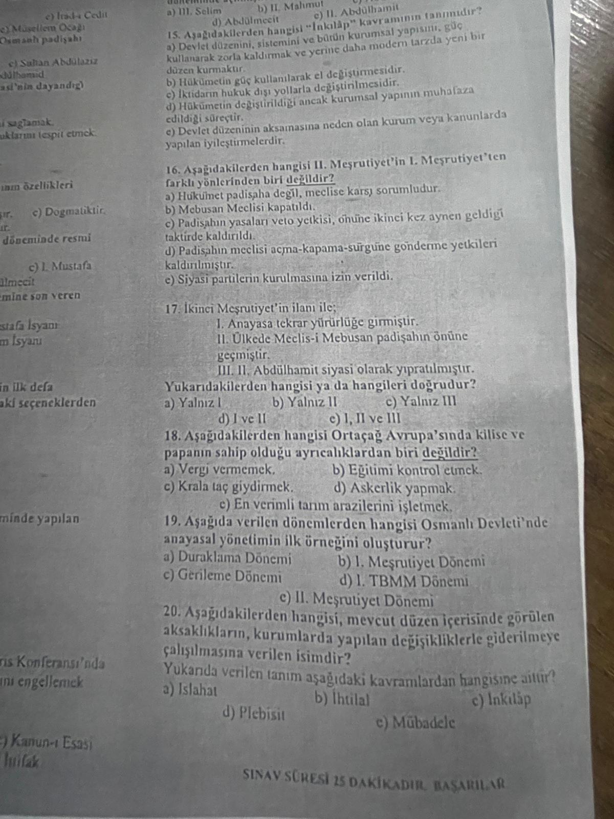 Genel açıklama: Görsel, tarih dersi çoktan seçmeli sınav sayfasıdır; Osmanlı Devleti’nde I. ve II. Meşrutiyet, anayasal yönetim, ıslahat-inkılap-ihtilal kavramları ve Ortaçağ Avrupa’sında kilise/papanın ayrıcalıkları gibi konuları içermektedir.