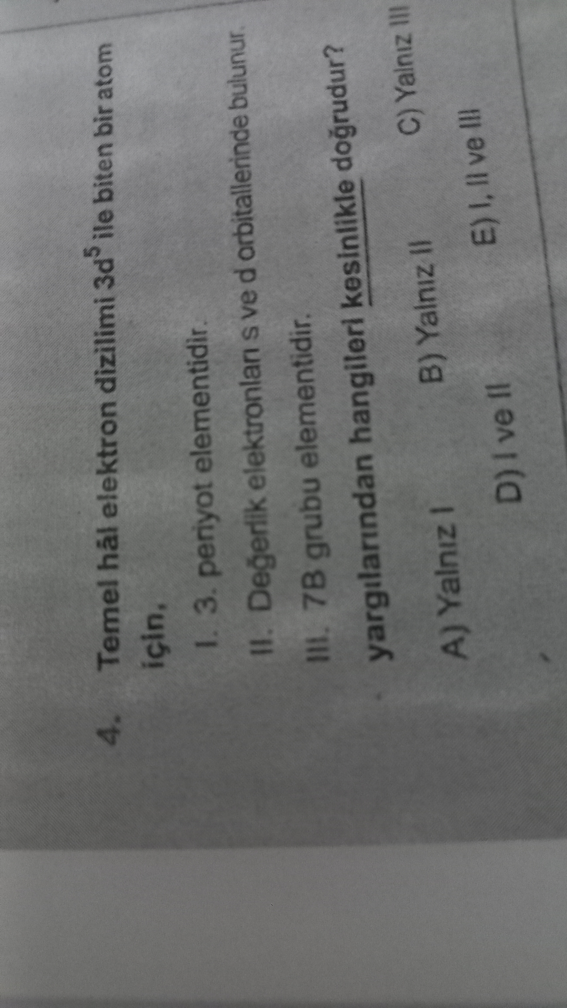 - III ise, sadece “$3d^5$ ile biten her atom 7B grubundadır” anlamına geldiğinde genel ifade oluyor; bu yüzden sınav mantığında kesin doğru kabul edilmez. (Başka elementlerin iyonları vb. 3d^5 alabilir.)