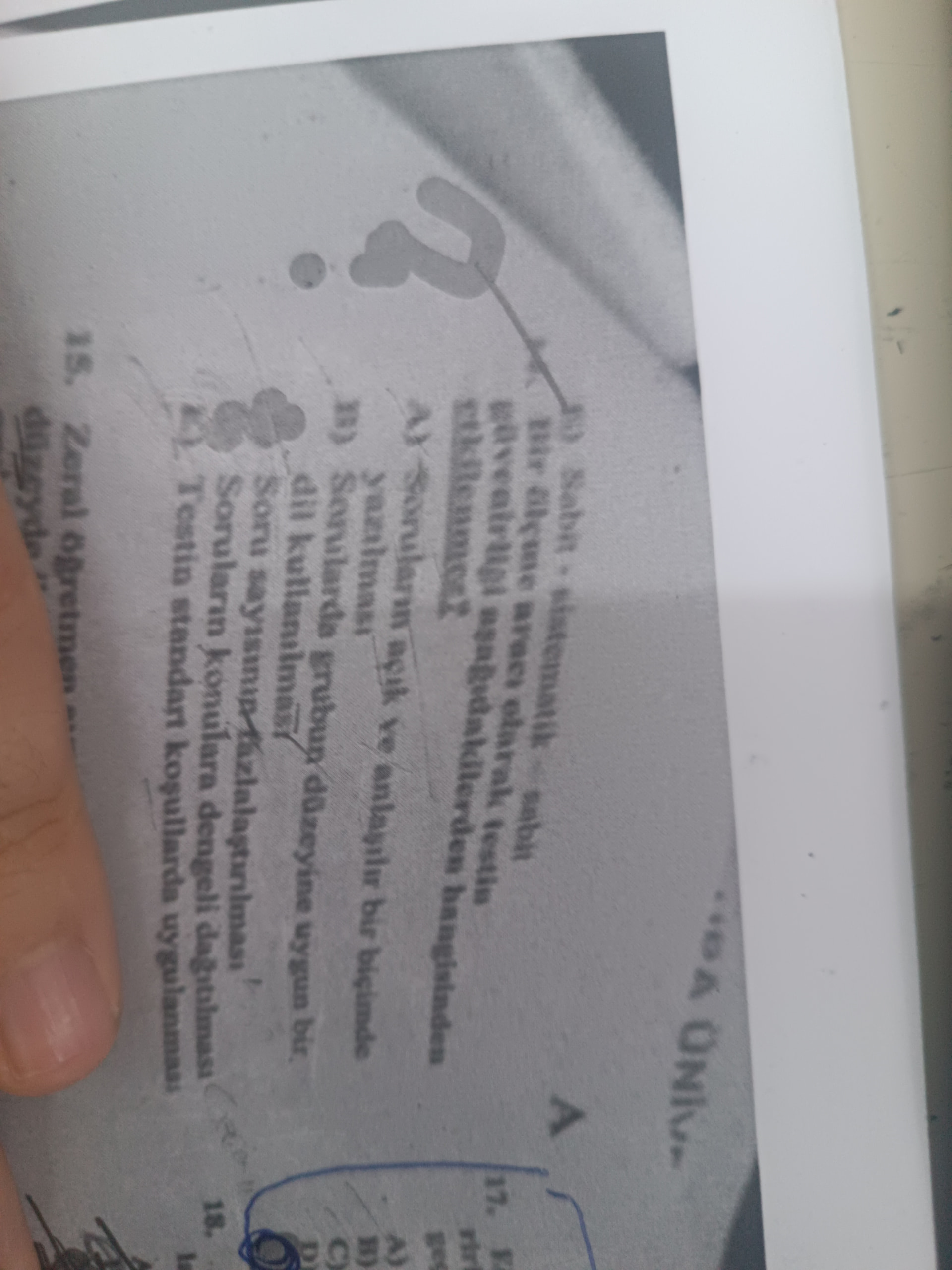 Görüntüde bir sınav veya test belgesi üzerinde farklı cevap şıkları ve kısmen okunabilen sorular yer alıyor. Detaylı bilgi veya bütün cümleler okunamadığı için belirgin bir konu tespiti yapmak zor.