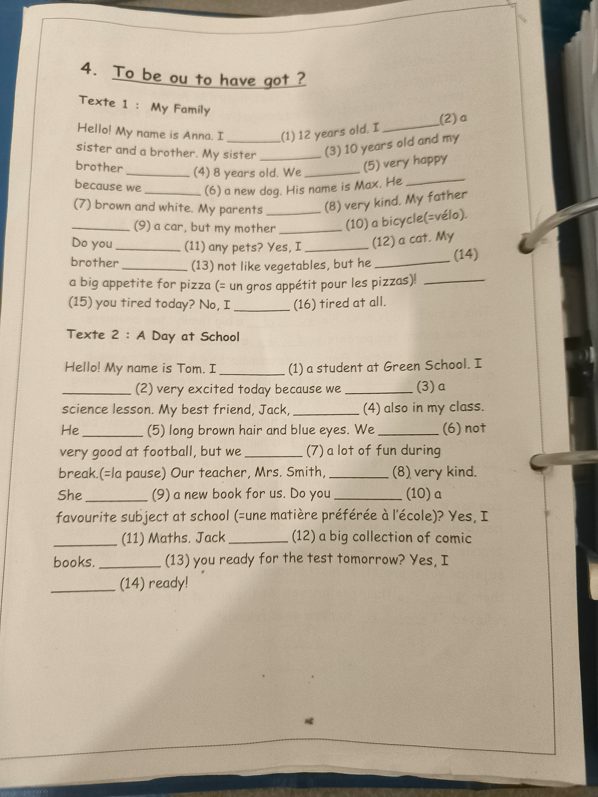 My best friend, Jack, (4) has got long brown hair and blue eyes. We (5) are very good at football and we (6) have got a lot of fun during break (la pause). Our teacher, Mrs. Smith, (7) is very kind. I (8) have got a new book for us. Do you (9) have a favourite subject at school (ta matière préférée à l’école)? Yes, I (10) like Maths. Jack (11) has got a big collection of comic books.