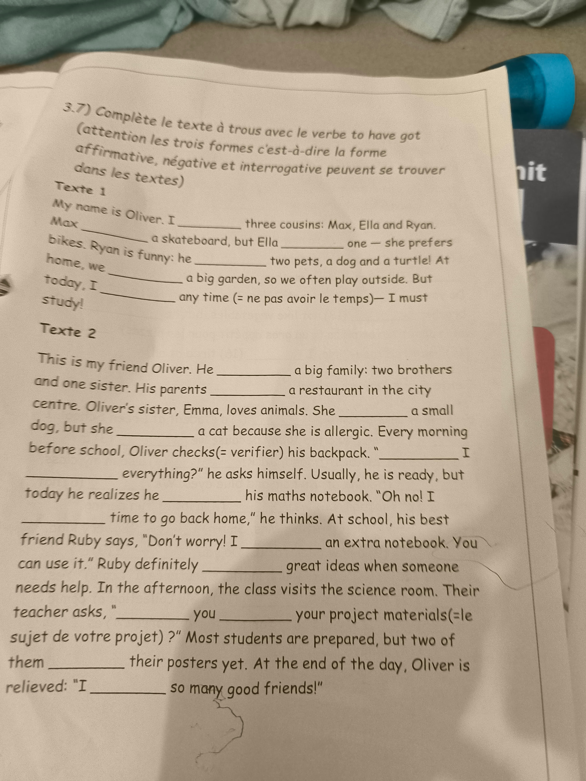 3.7) Complète le texte à trous avec le verbe to have got (attention les trois formes c’est-à-dire la forme affirmative, négative et interrogative peuvent se trouver dans les textes)
