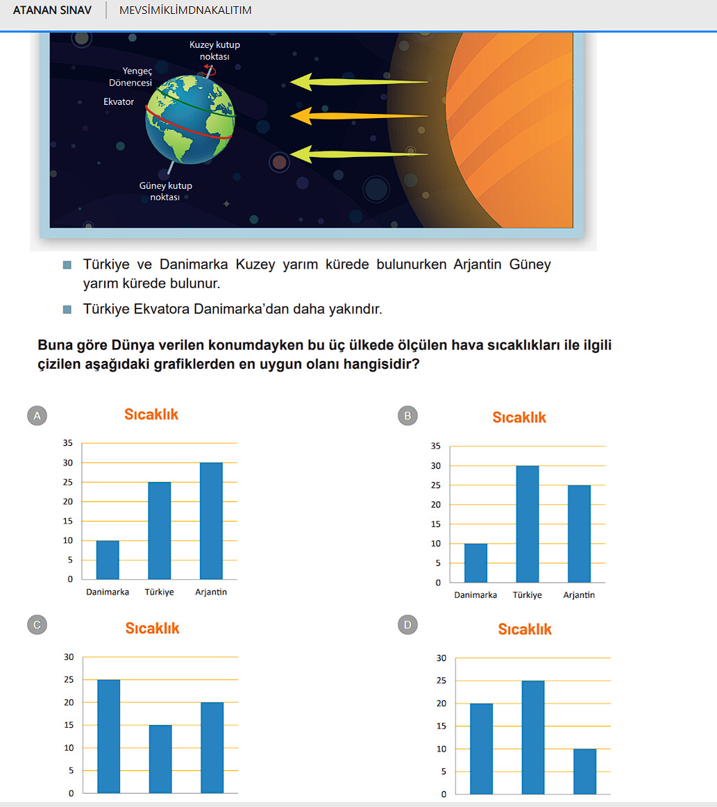 Buna göre Dünya verilen konumdayken bu üç ülkede ölçülen hava sıcaklıkları ile ilgili çizilen aşağıdaki grafiklerden en uygun olanı hangisidir?