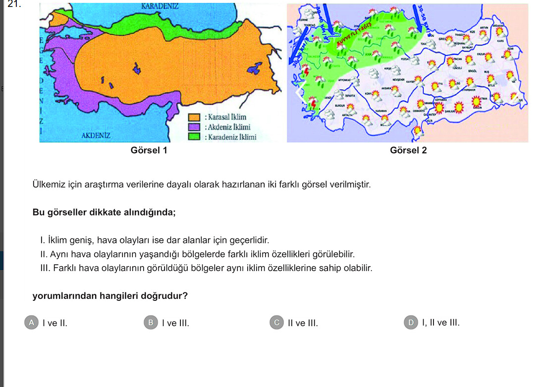 - II: Aynı kısa süreli hava olayı (ör. yağmur) farklı iklim bölgelerinde de ortaya çıkabilir; bu nedenle aynı hava olayının görüldüğü yerlerin iklimleri farklı olabilir.