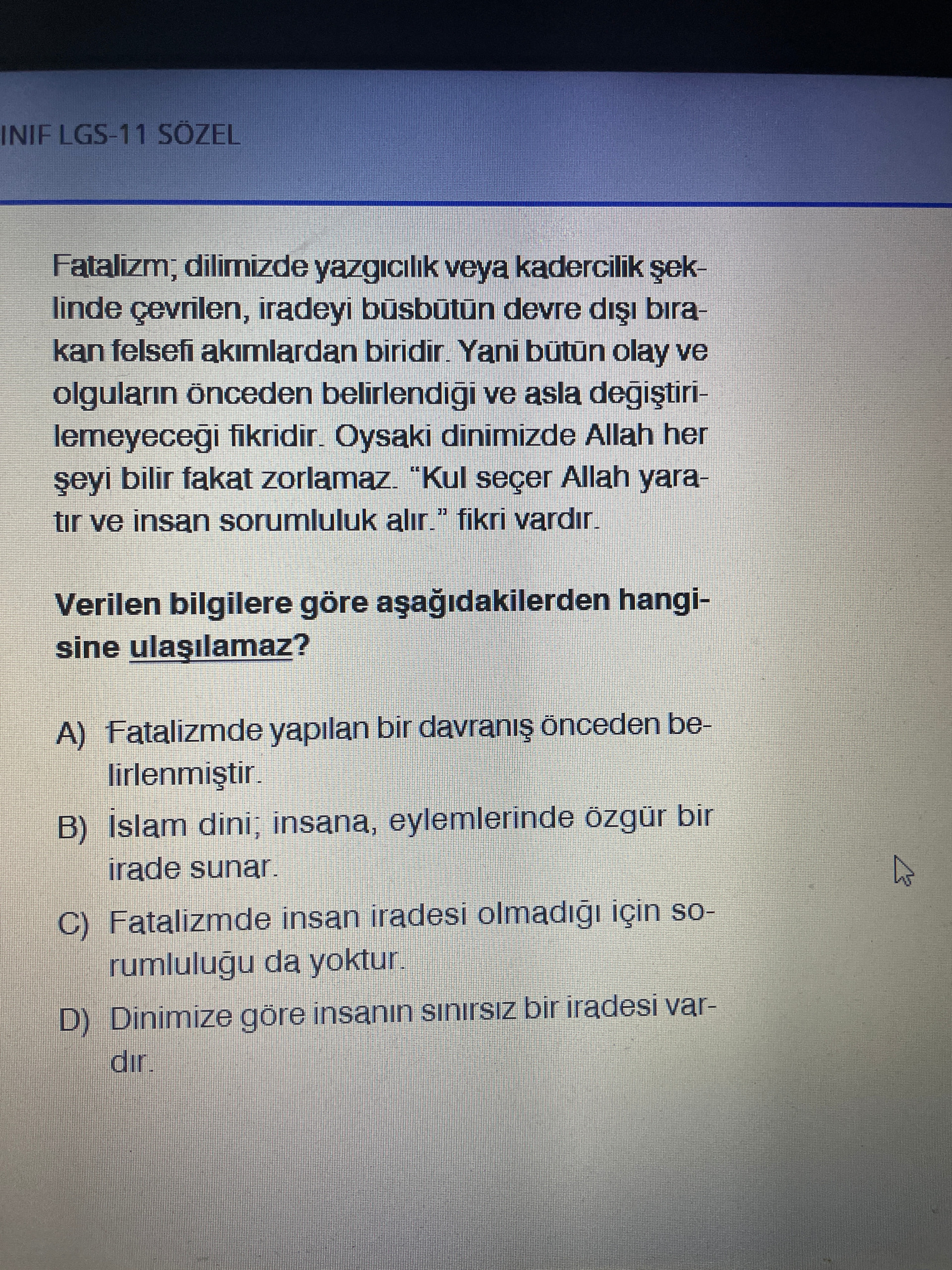 Soruda “hangisine ulaşılamaz?” deniyor. Paragrafta İslam’da insana özgür irade verildiği açıkça yazılı ve bu B seçeneğine ulaşılabileceğini gösteriyor. Ancak D seçeneğinde iddia edilen “sınırsız irade” paragrafta geçmiyor.