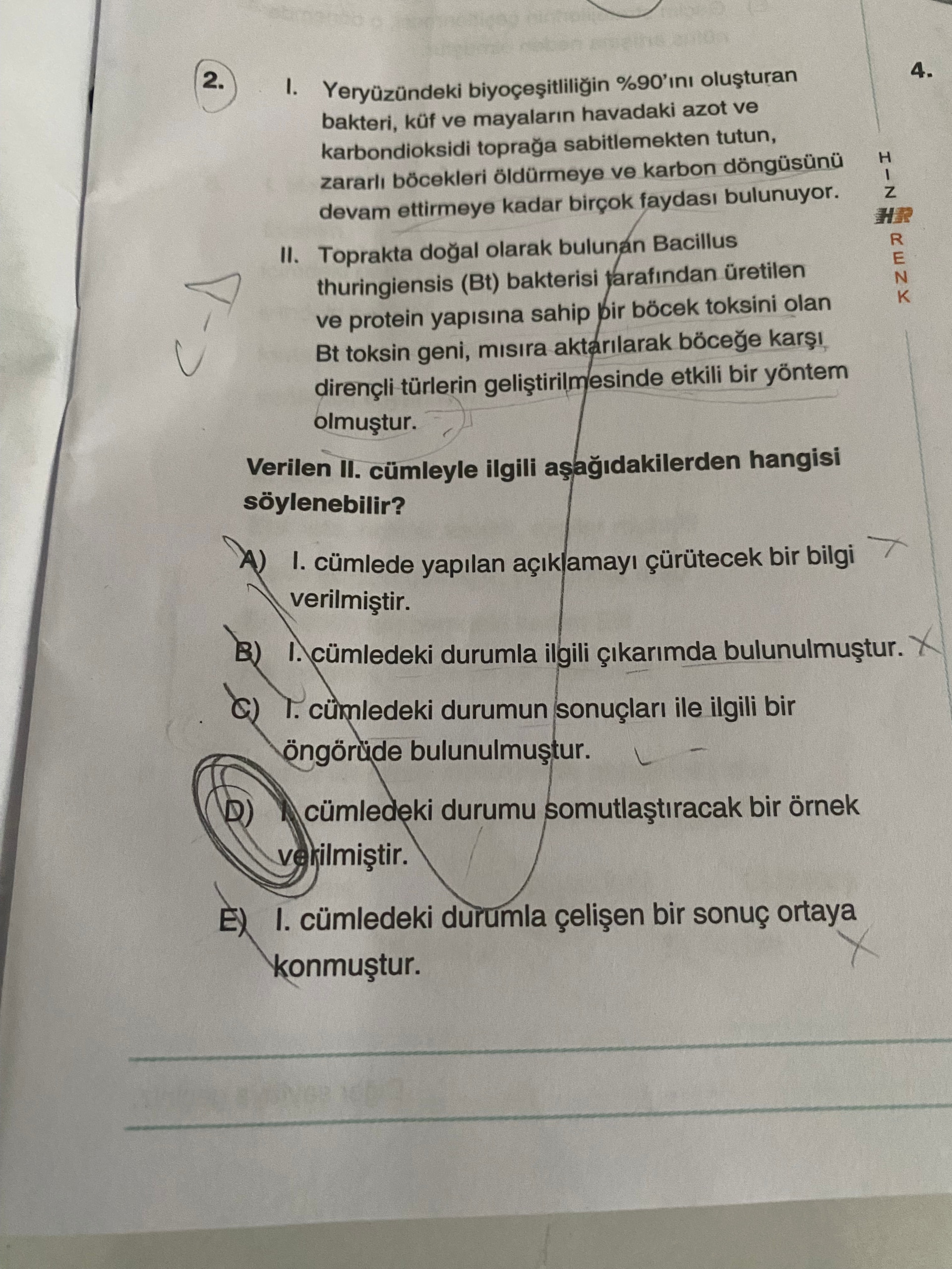 Genel açıklama: Metin, mikroorganizmaların (özellikle bakterilerin) ekosistemdeki yararlarını ve Bacillus thuringiensis (Bt) bakterisinin toksin geninin mısıra aktarılmasıyla böceklere dirençli türler geliştirilmesini anlatan bir paragraf ile, bu bilgiyi temel alan çoktan seçmeli bir Türkçe yorum sorusundan oluşuyor.