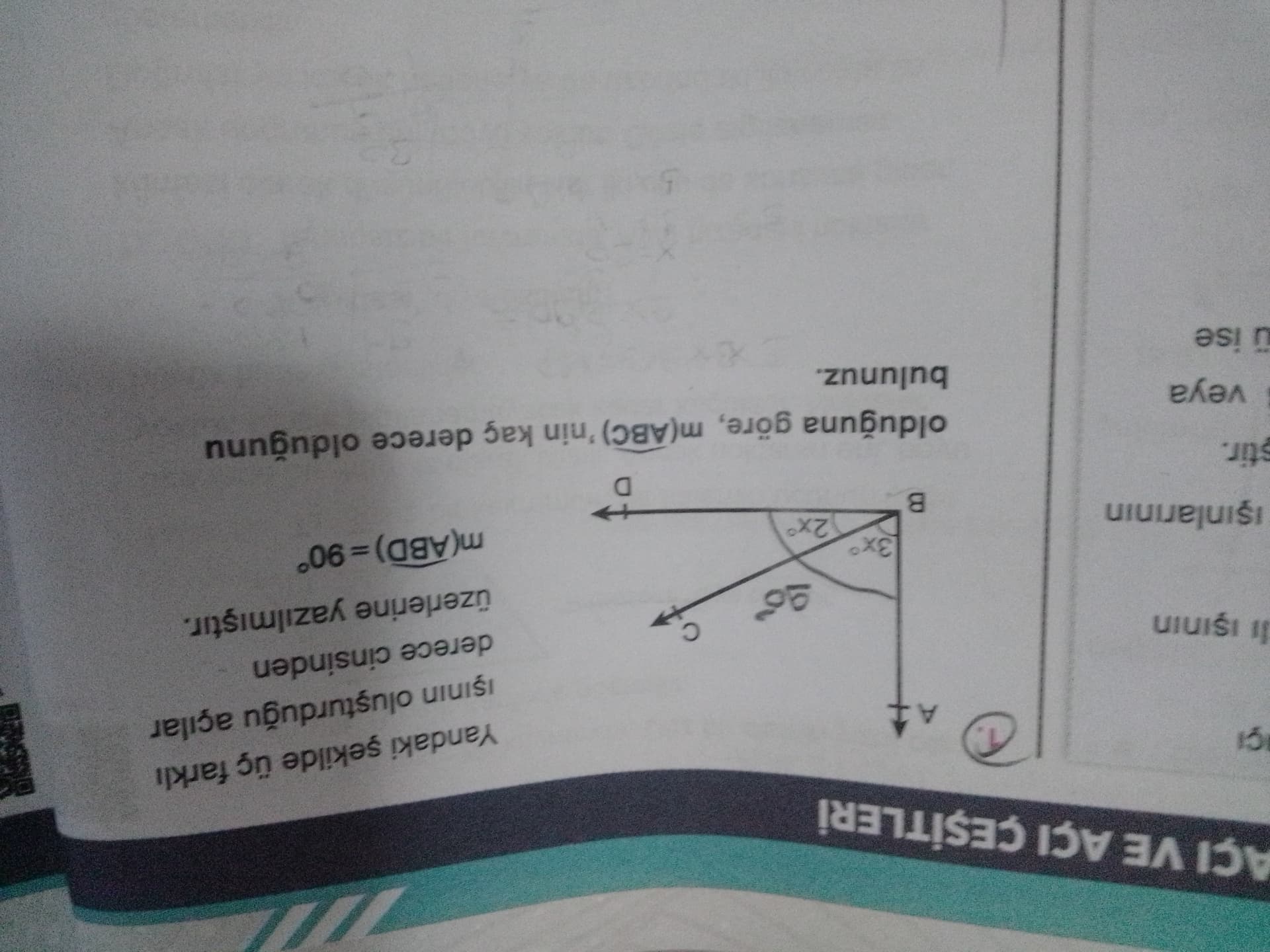Bu resim bir matematik problemine aittir. Verilen şekle göre açıların ölçüleri ve doğru açılar üzerinden bir problem çözülmektedir.