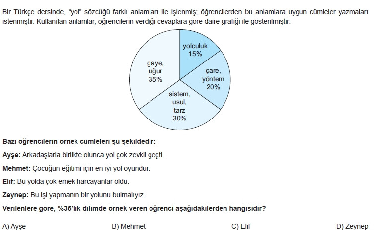Bir Türkçe dersinde, “yol” sözcüğü farklı anlamları ile işlenmiş; öğrencilerden bu anlamlara uygun cümleler yazmaları istenmiştir. Kullanılan anlamlar, öğrencilerin verdiği cevaplara göre daire grafiği ile gösterilmiştir.