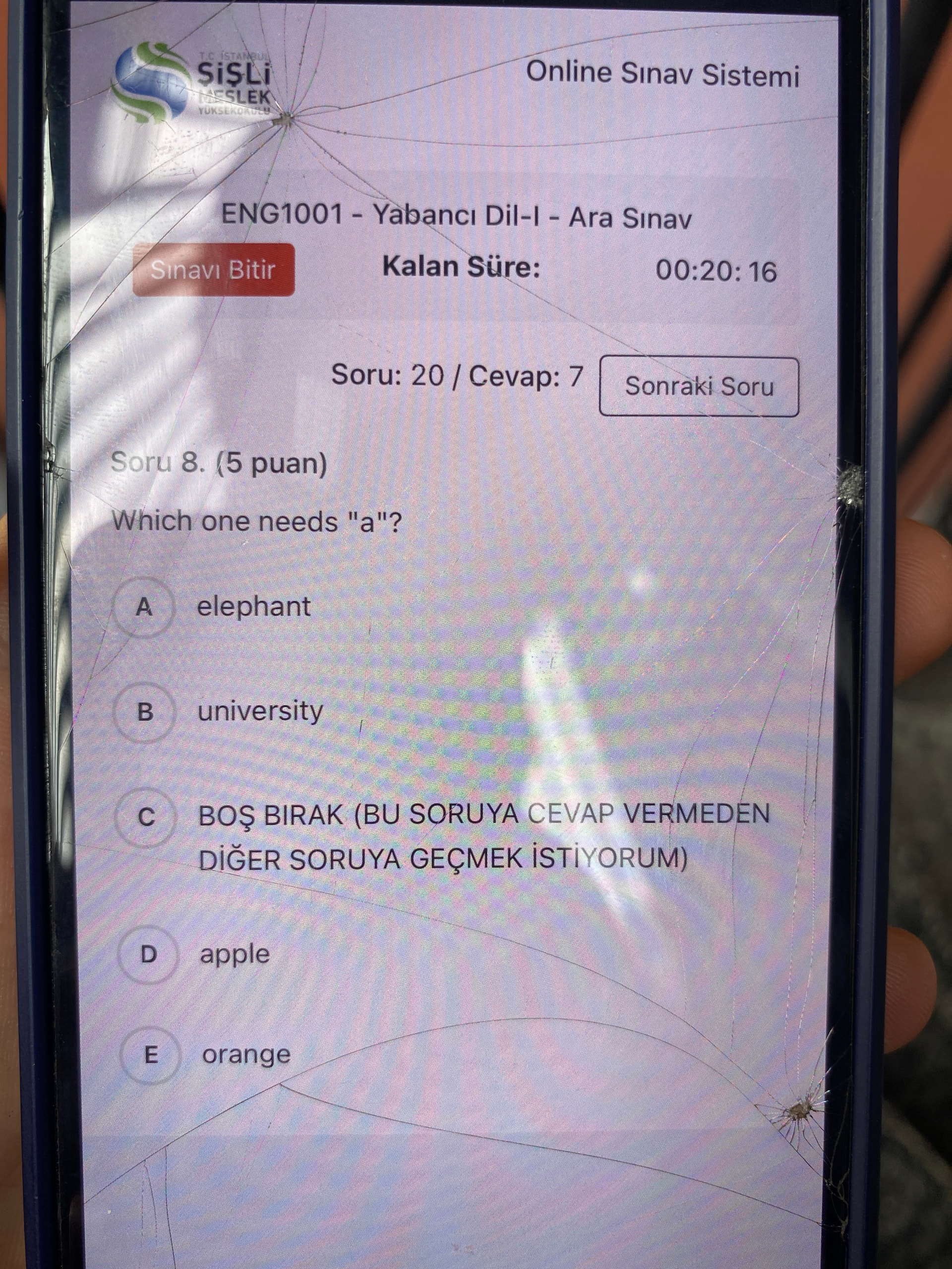 Doğru cevap: B) university. Çünkü a/an ayrımı harfe değil, sese (sesletime) göre yapılır ve “university” /juː/ şeklinde “y” sesiyle başlar, bu yüzden a university deriz.