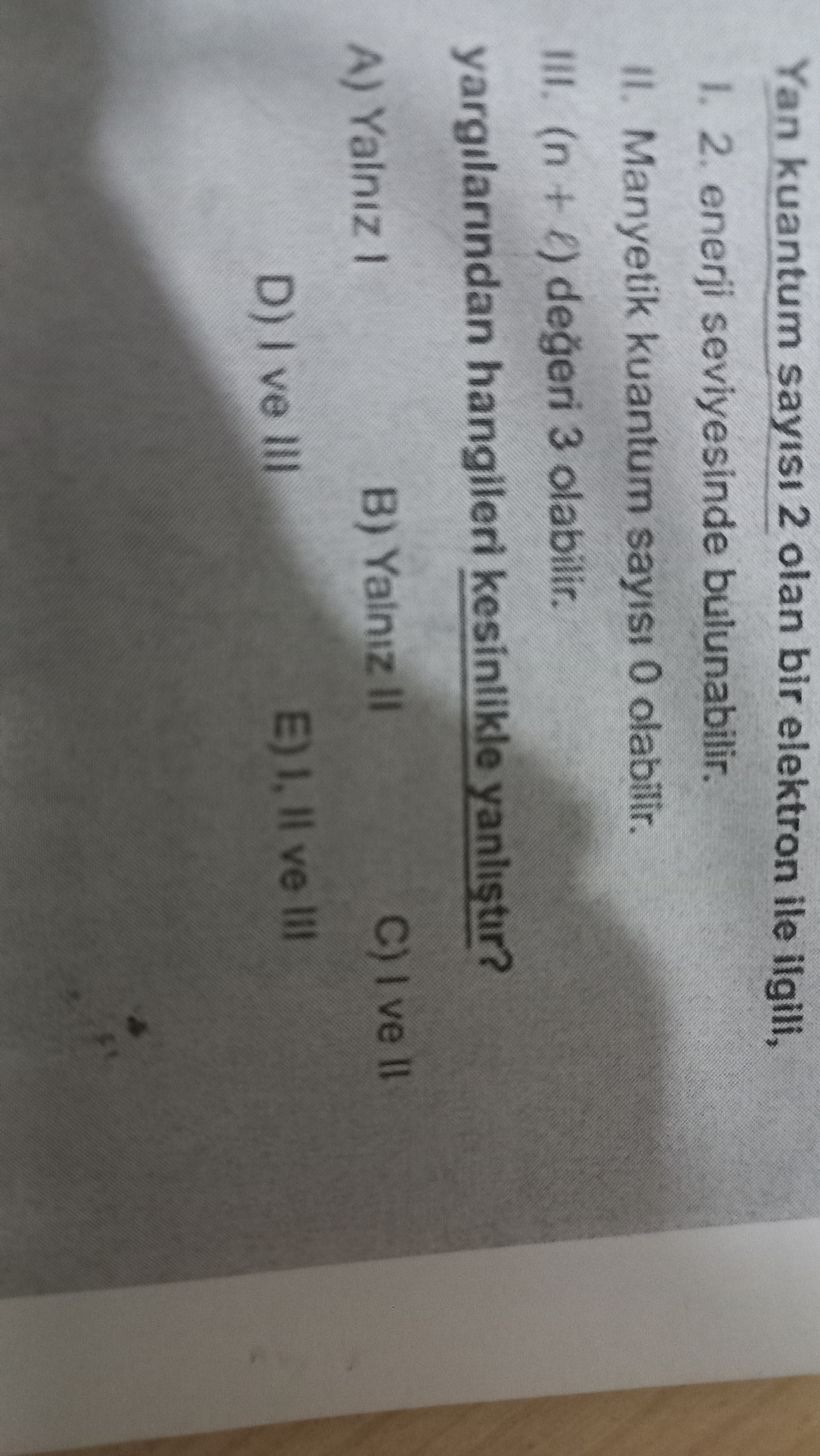 III. Yargı: “$ (n + l) değeri 3 $ olabilir.”