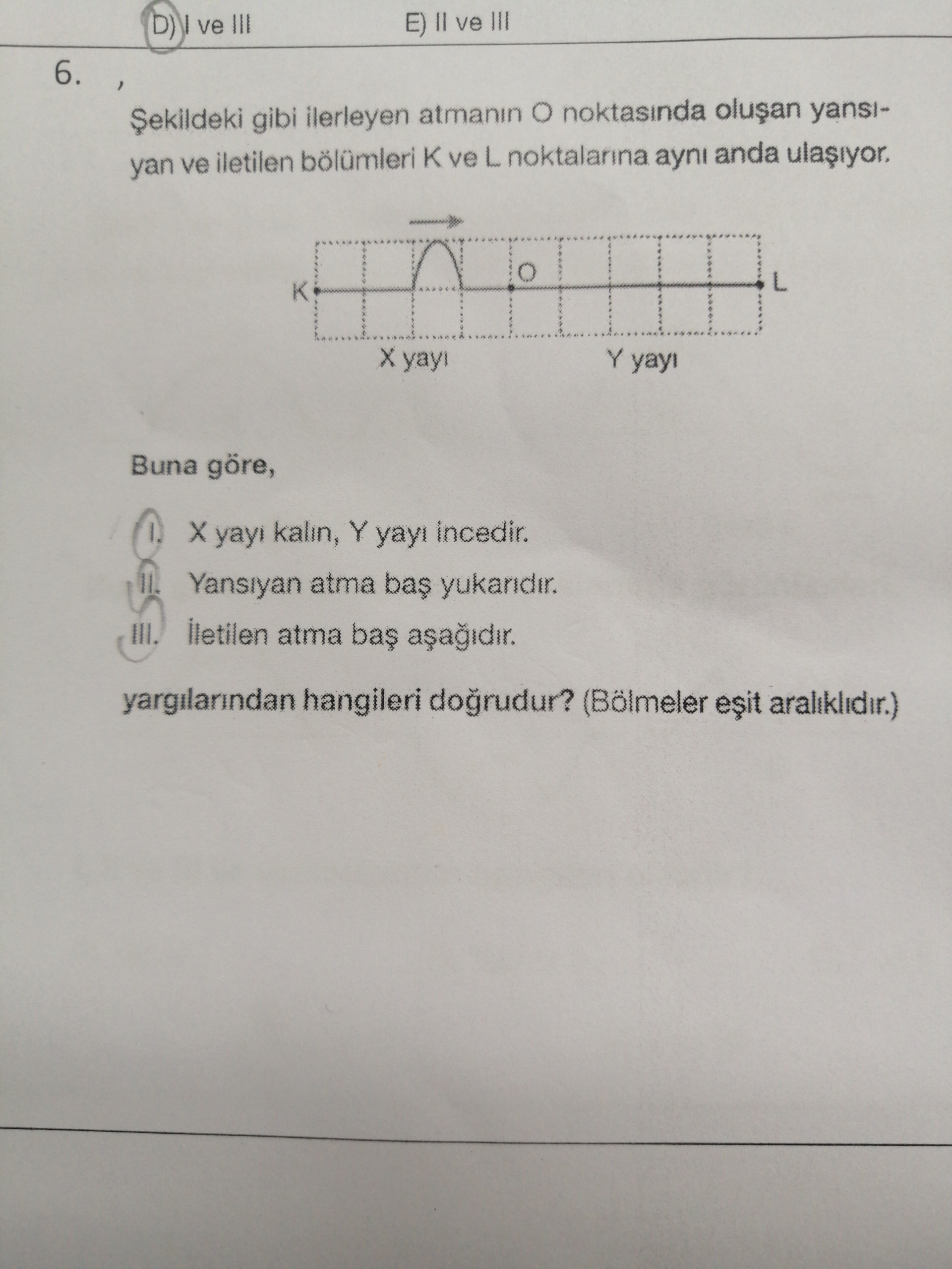 Görsel, iki farklı yay (X ve Y) arasında ilerleyen bir atmanın O noktasında kısmi yansıma ve iletimini anlatan çoktan seçmeli bir fizik sorusudur; yansıyan ve iletilen atmaların K ve L’ye aynı anda ulaştığı bilgisiyle I–III yargılarının doğruluğu sorgulanmaktadır.