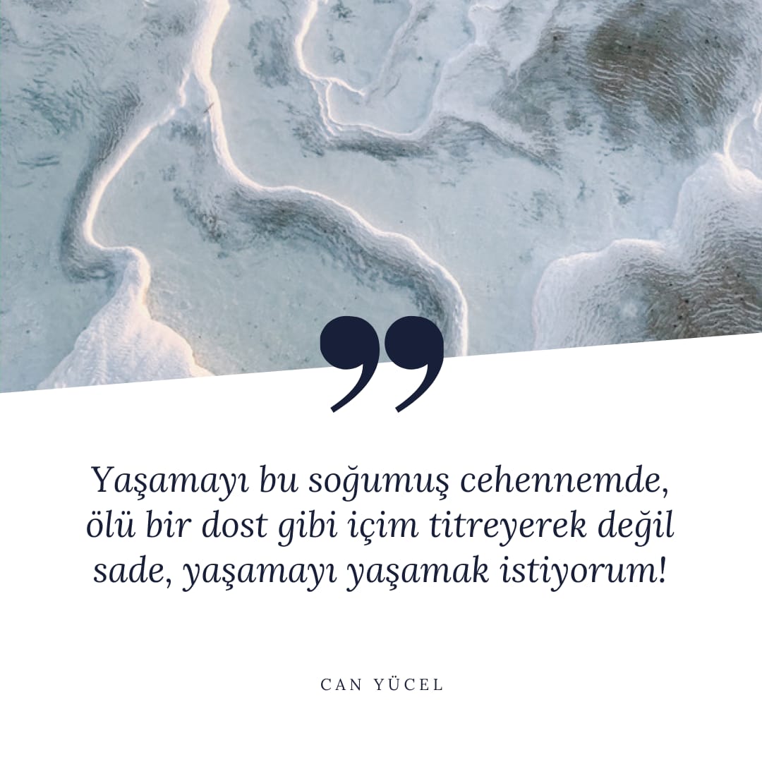 Bu görselde, Can Yücel’e ait bir şiirden alıntı yer almakta. Alıntı, yaşamı dolu dolu yaşama arzusunu ifade ediyor. Arka planda doğal bir manzara bulunuyor.