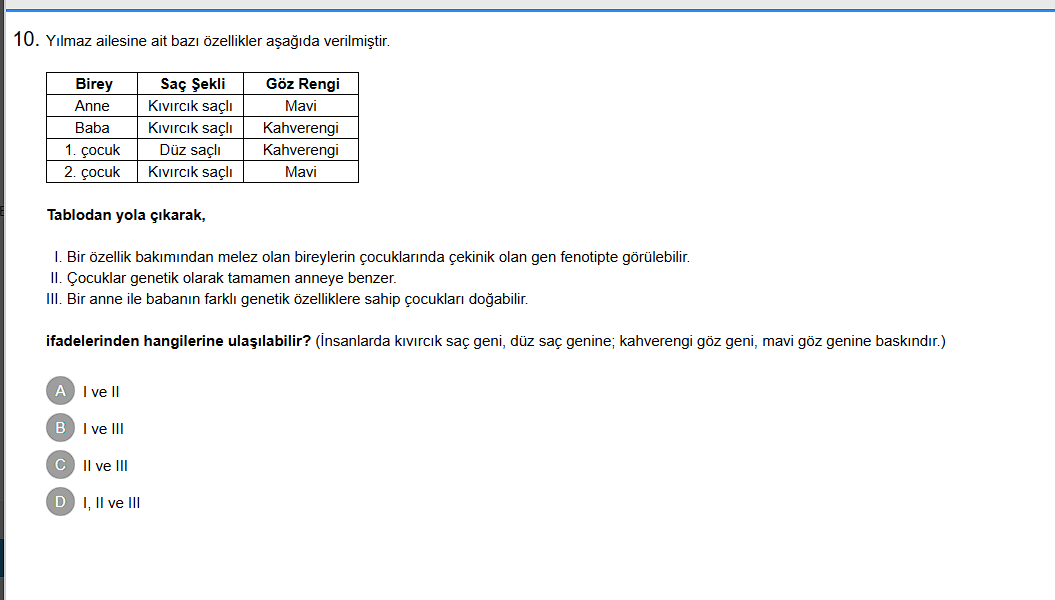 - Aynı anne-babadan farklı genotipte ve fenotipte çocuklar doğabilir (ör. 1. çocuk düz saç, 2. çocuk kıvırcık saç) ⇒ III doğru.