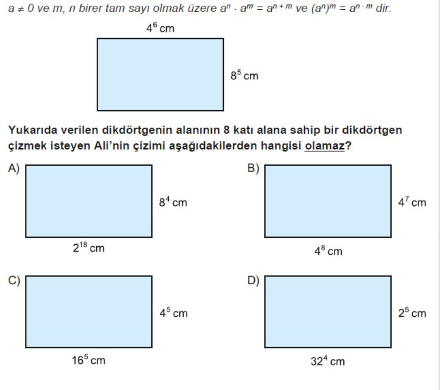 Yukarıda verilen dikdörtgenin alanının 8 katı alana sahip bir dikdörtgen çizmek isteyen Ali’nin çizimi aşağıdakilerden hangisi olamaz?