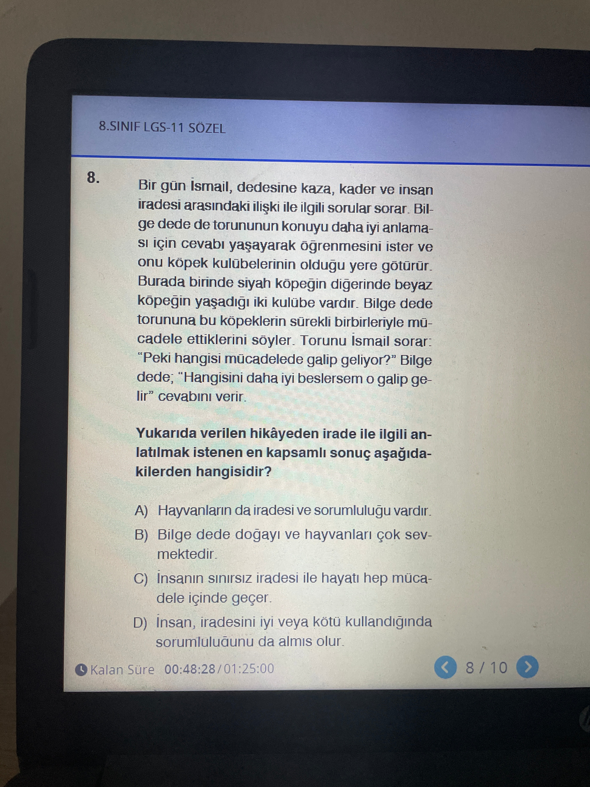 Genel açıklama: Görsel, 8. sınıf LGS sözel bölümünden bir çoktan seçmeli okuma-anlama sorusunu içeriyor; irade, kader ve insanın sorumluluğu temalı kısa bir hikâye üzerinden çıkarım yapmayı istiyor.
