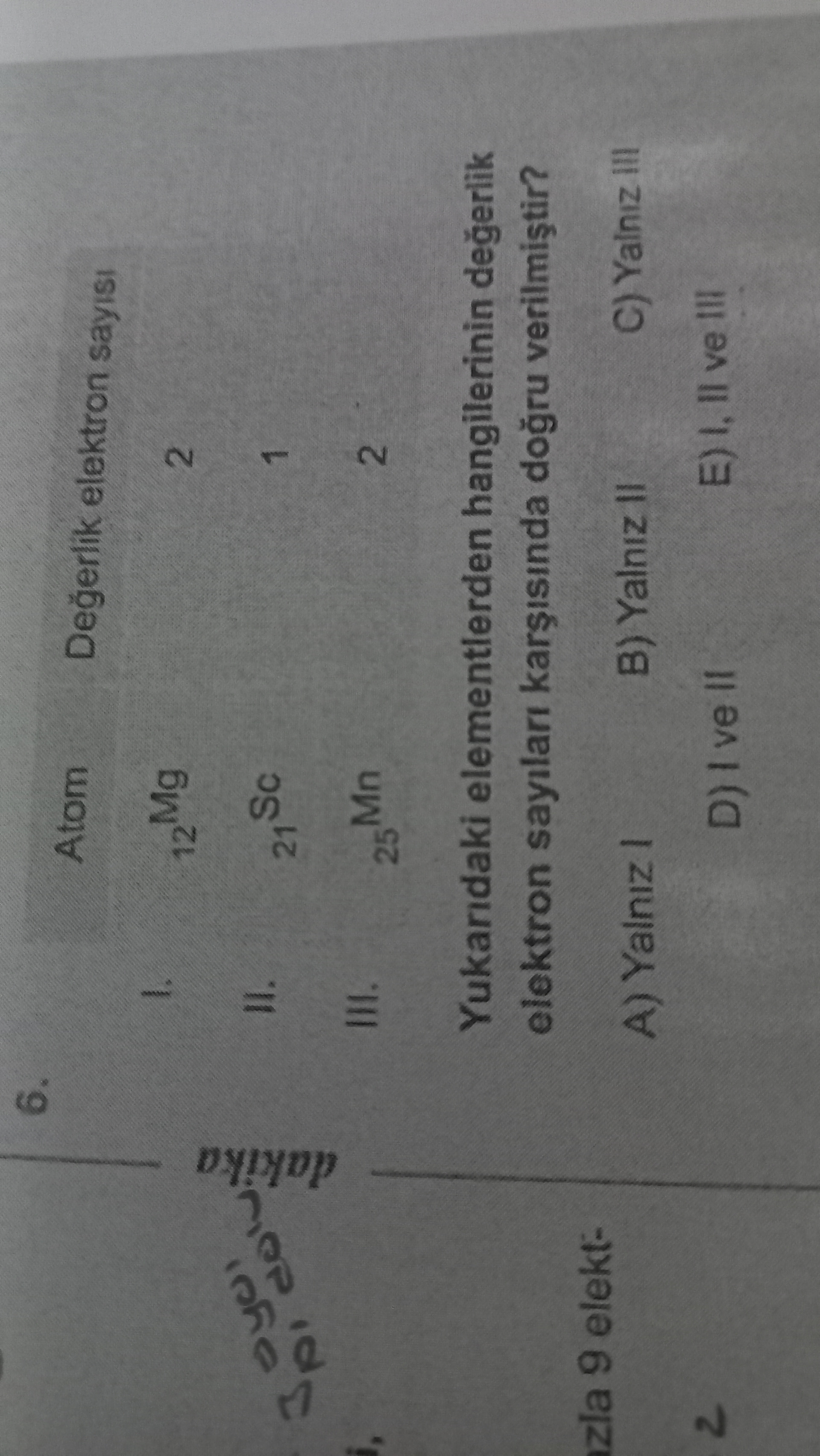 Metinden anlaşıldığı hâliyle doğru olan tek satır Mg’nin 2 değerlik elektronu olduğudur. Bu da şıklarda C) Yalnız III olarak verilmiş.