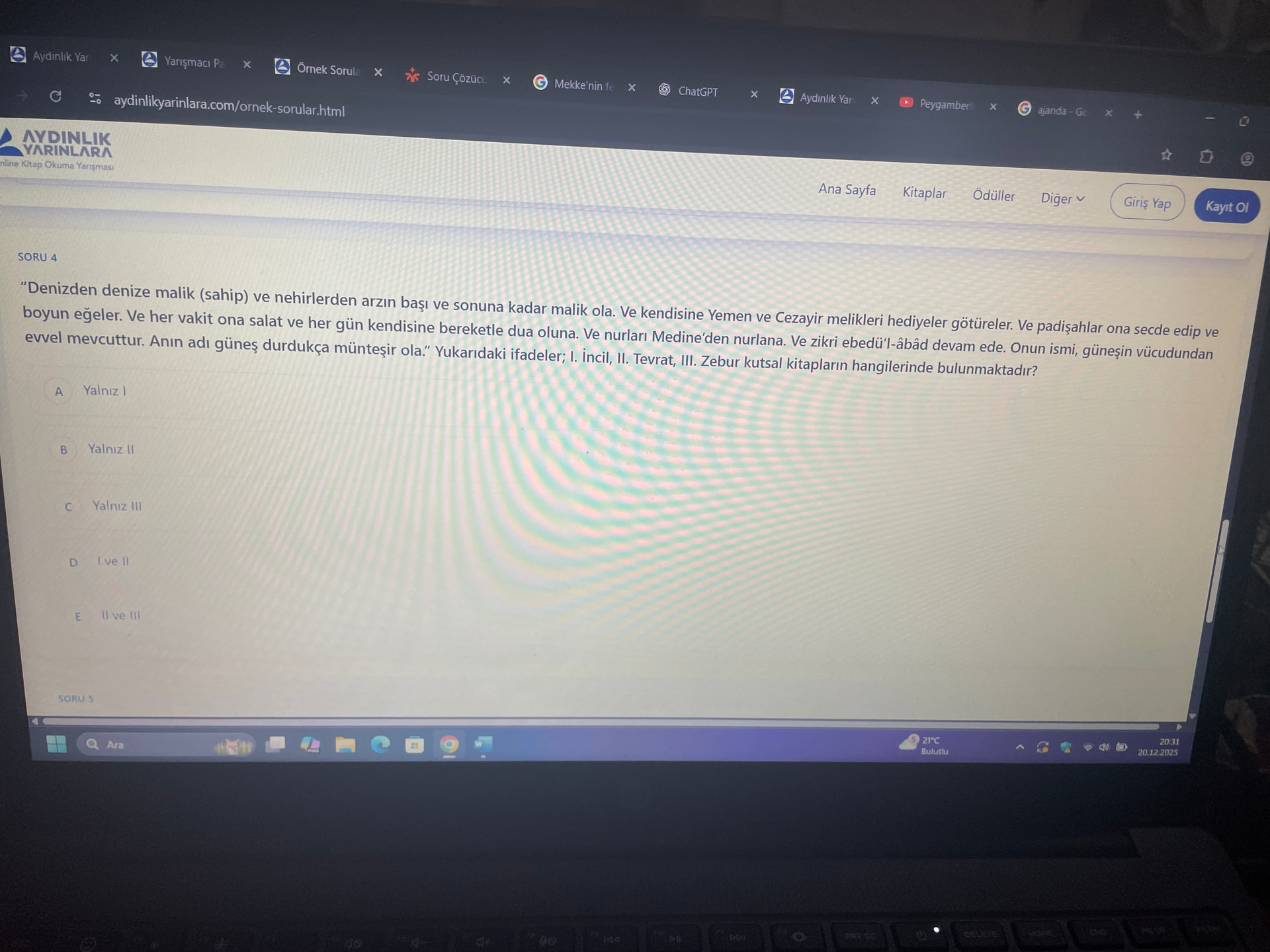 Görüntü, bir yayınevinin “İlahi Kitap Okuma Yarışması” sayfasındaki örnek çoktan seçmeli soruyu ve şıklarını gösteriyor; soru, kutsal kitaplarda geçen ifadelere dair.
