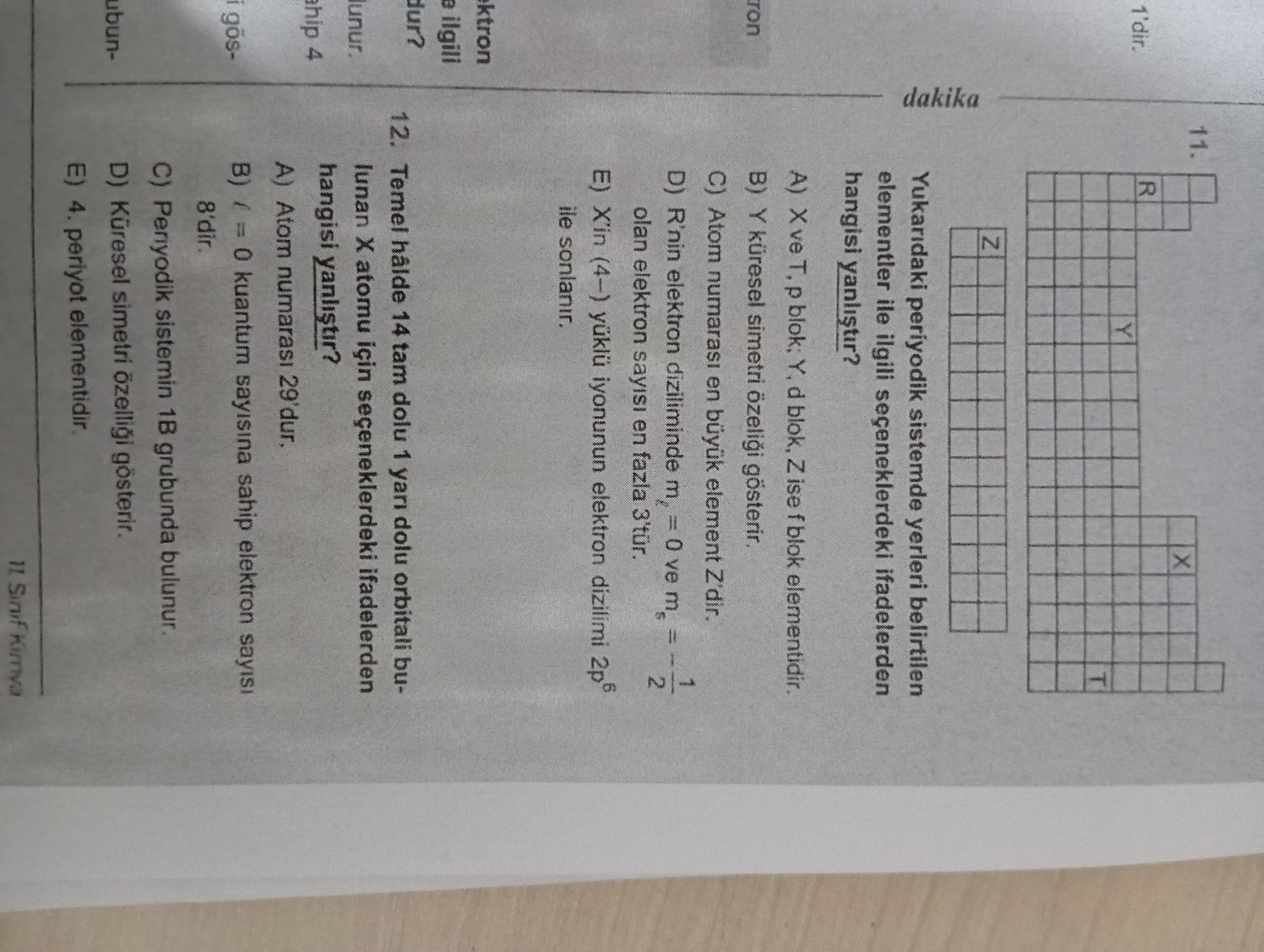 “Yukarıdaki periyodik sistemde yerleri verilen X, Y, Z ve T elementleri ile ilgili aşağıdaki ifadelerden hangisi yanlıştır?”