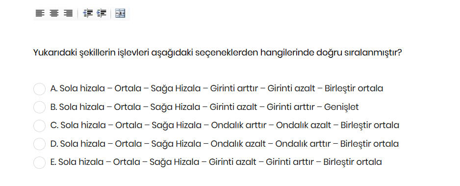 E seçeneği “Sola hizala – Ortala – Sağa hizala – Girinti azalt – Girinti artır – Birleştir ortala” olarak bu sırayı doğru vermiştir.