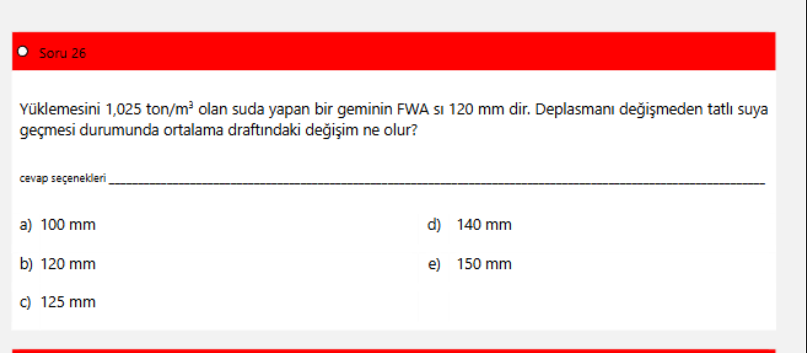 Yüklemesini 1,025 ton/m³ olan suda yapan bir geminin FWA’sı 120 mm’dir. Deplasmanı değişmeden tatlı suya geçmesi durumunda ortalama draftındaki değişim ne olur?