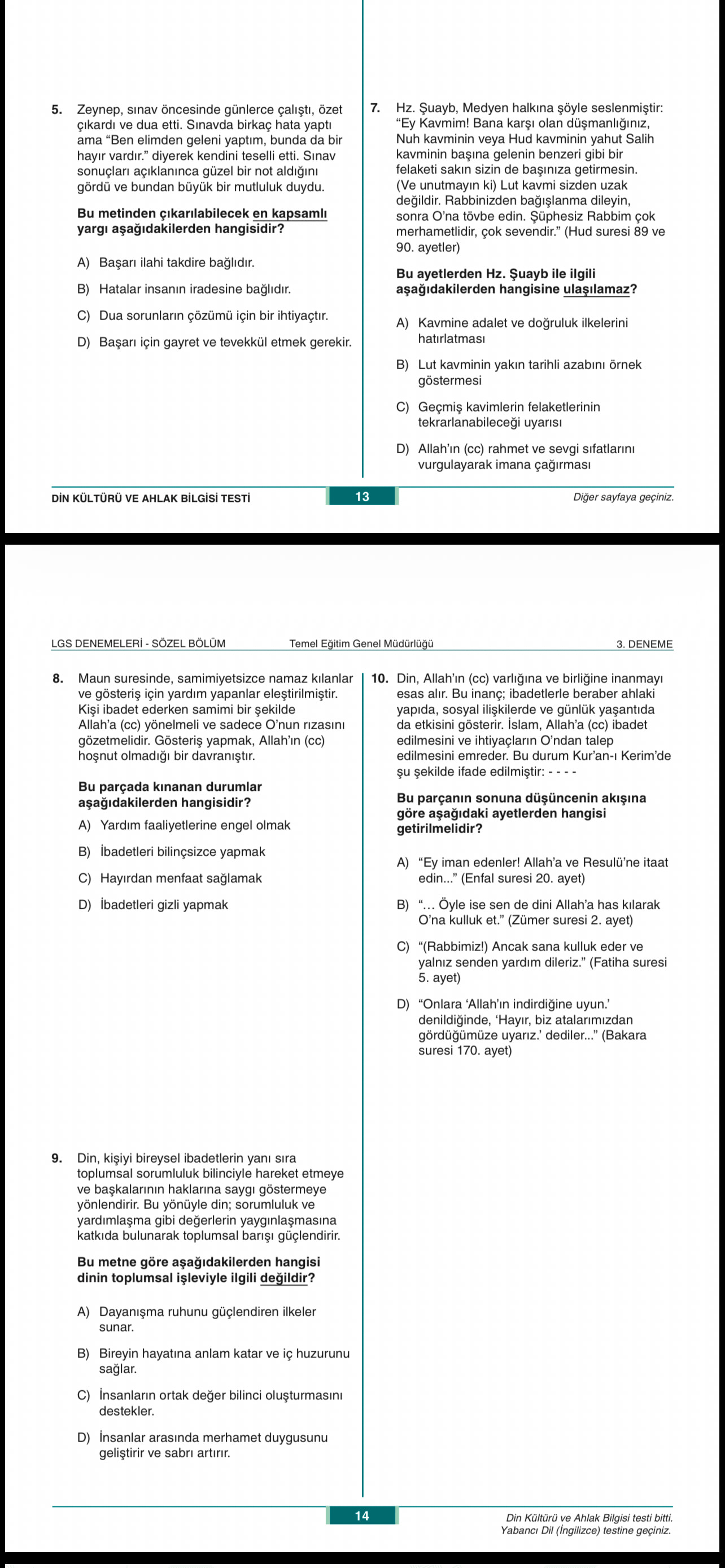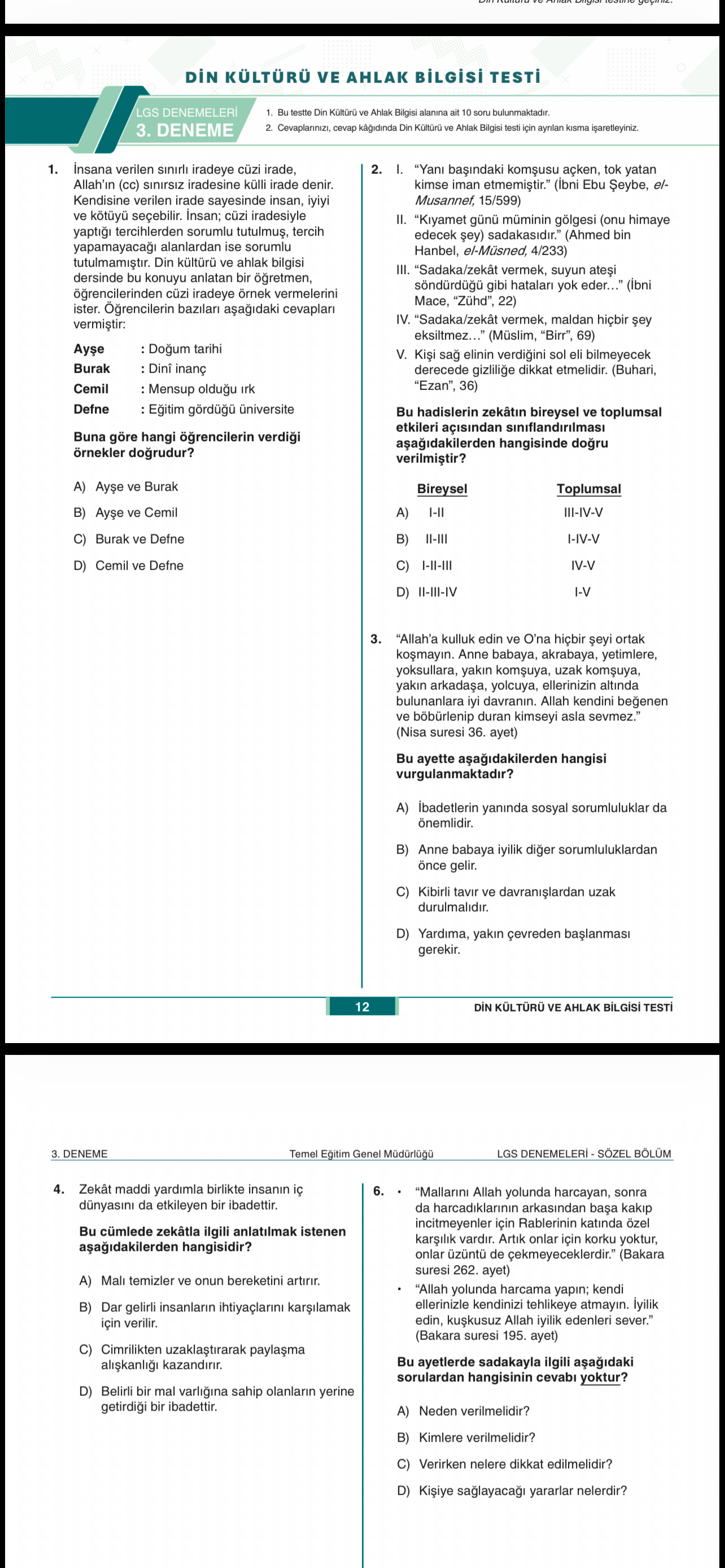 Görüntüler, ağırlıklı olarak din kültürü ve ahlak bilgisi alanında çeşitli sorular içeren sınav metinlerini göstermektedir. Sorular, bireysel ve toplumsal sorumluluklar, irade, zekâtın anlamı ve pratik önemi gibi konular üzerinde yoğunlaşmaktadır. Sorular, dini ve ahlaki bilgiyle ilgili kavramların nasıl anlaşılması gerektiğine dair örneklerle ve ayetlerle desteklenmiştir.